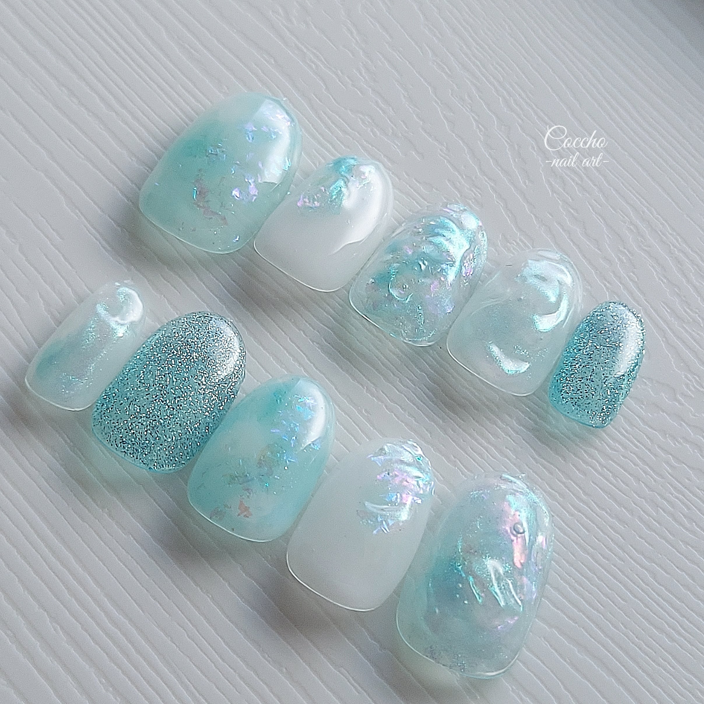 ・左小指、右薬指→エメラルドグリーンの淡いニュアンスネイルに、表面をオーロラうるうるにしました。