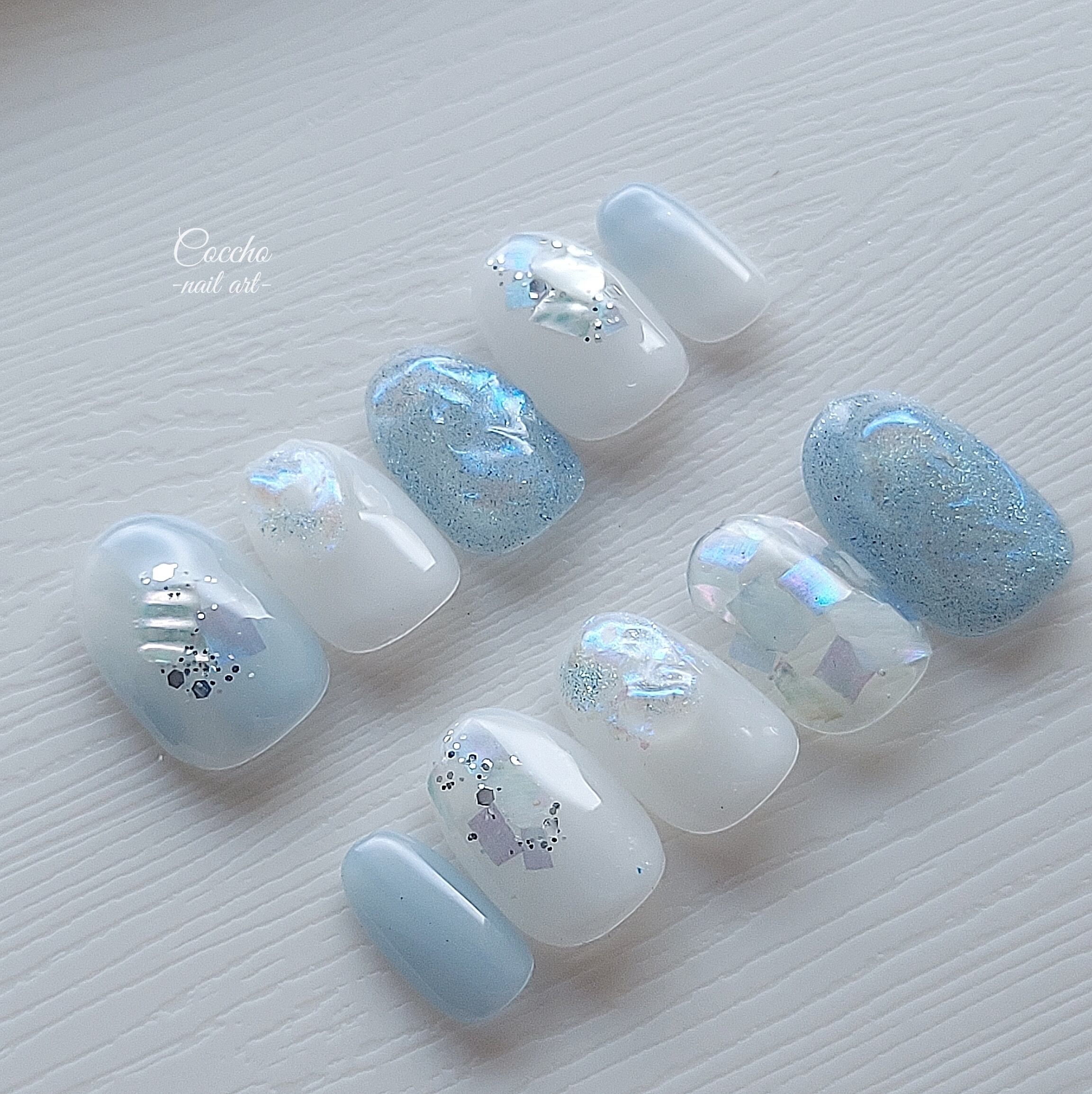 No.333 うるうるブルーのシェルネイル / ネイルチップ ジェルネイル ネイル ブルー 青 水色 ニュアンス マグネット キラキラ オーロラ シェル うるうる ちゅるん 夏 綺麗