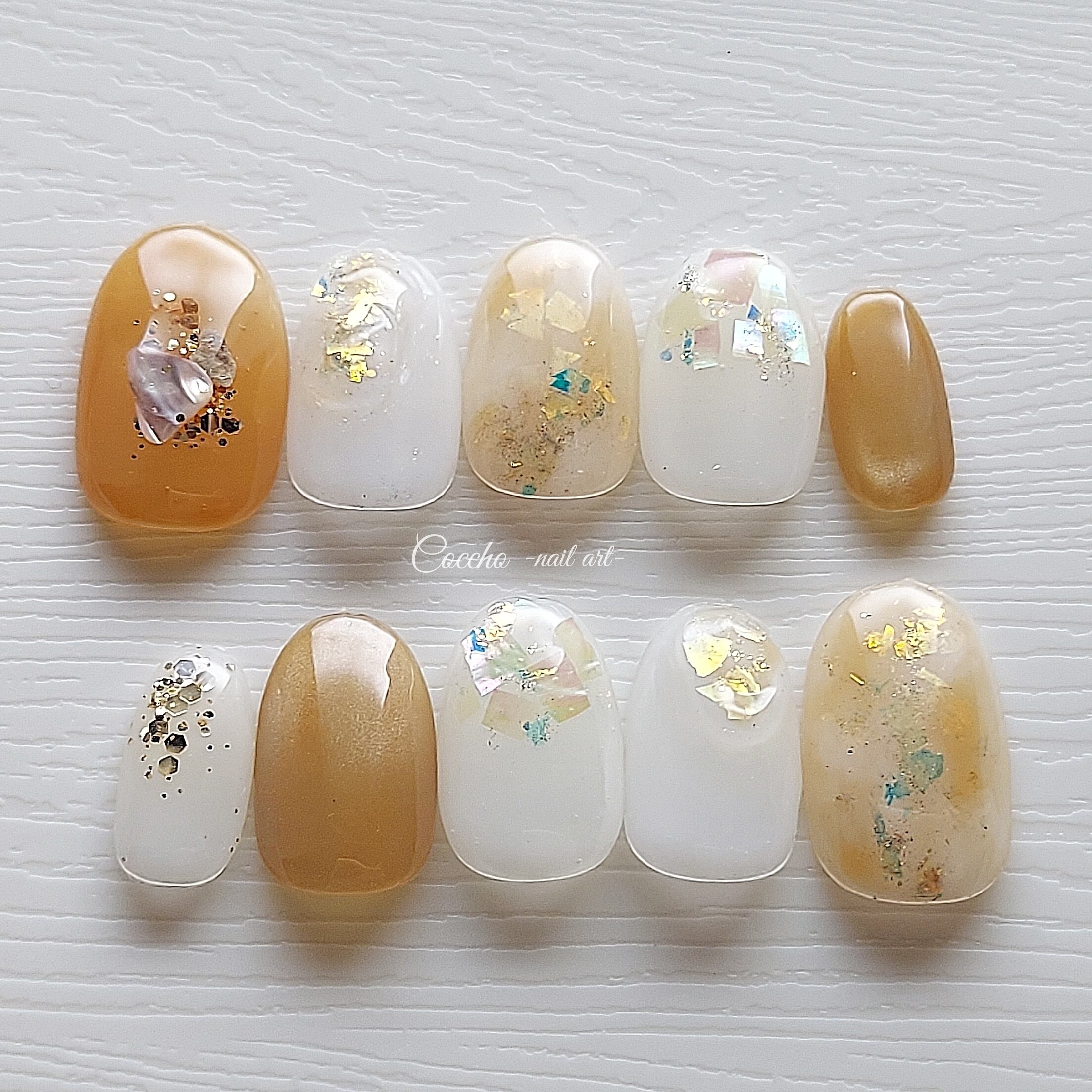 ・左中指、右薬指→シアーホワイトをベースに、オレンジ系オーロラシェル等で飾りました。