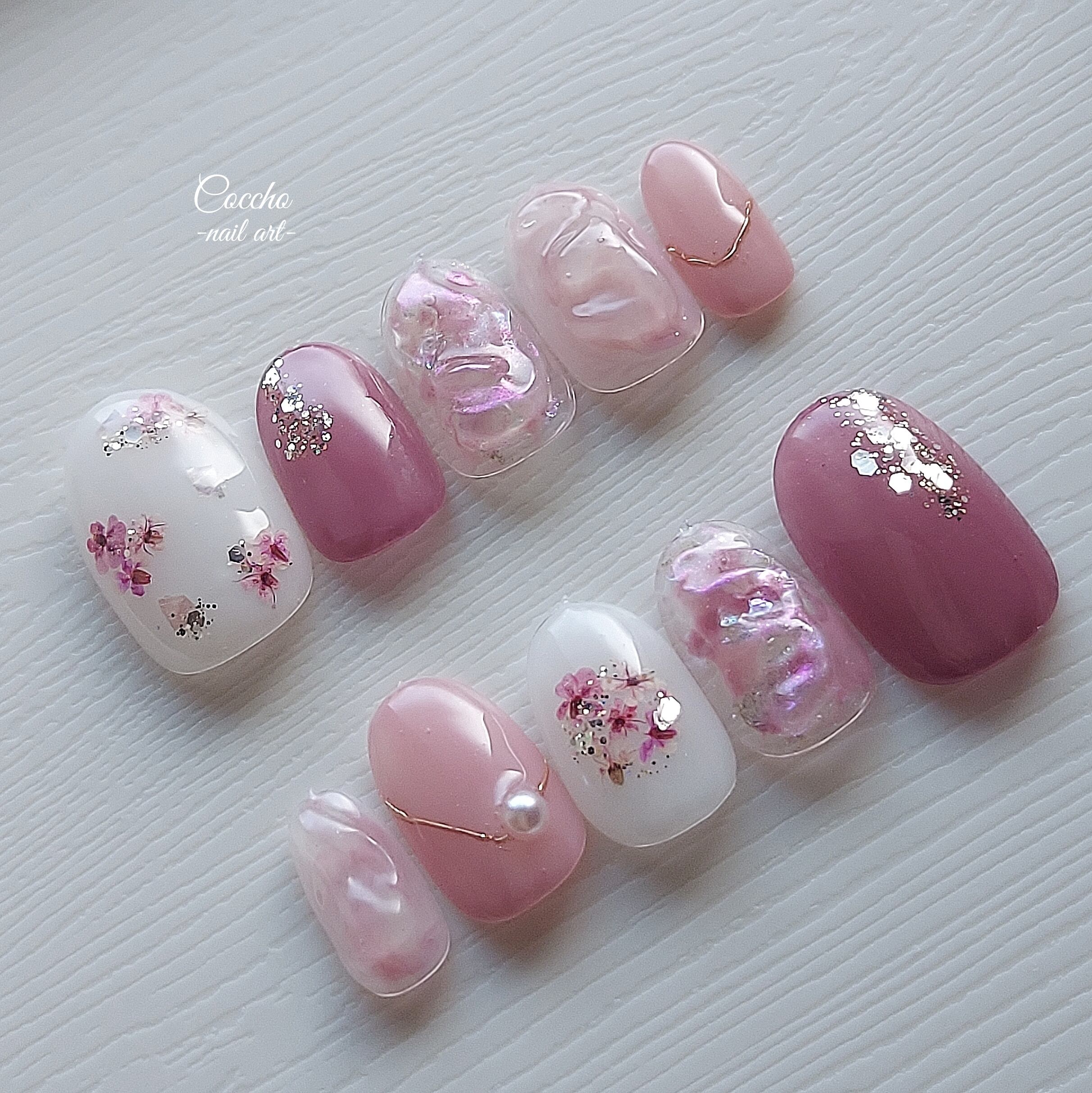 ・左中指、右親指→シアーホワイトをベースに、ピンク系押し花やシェル等で飾りました。