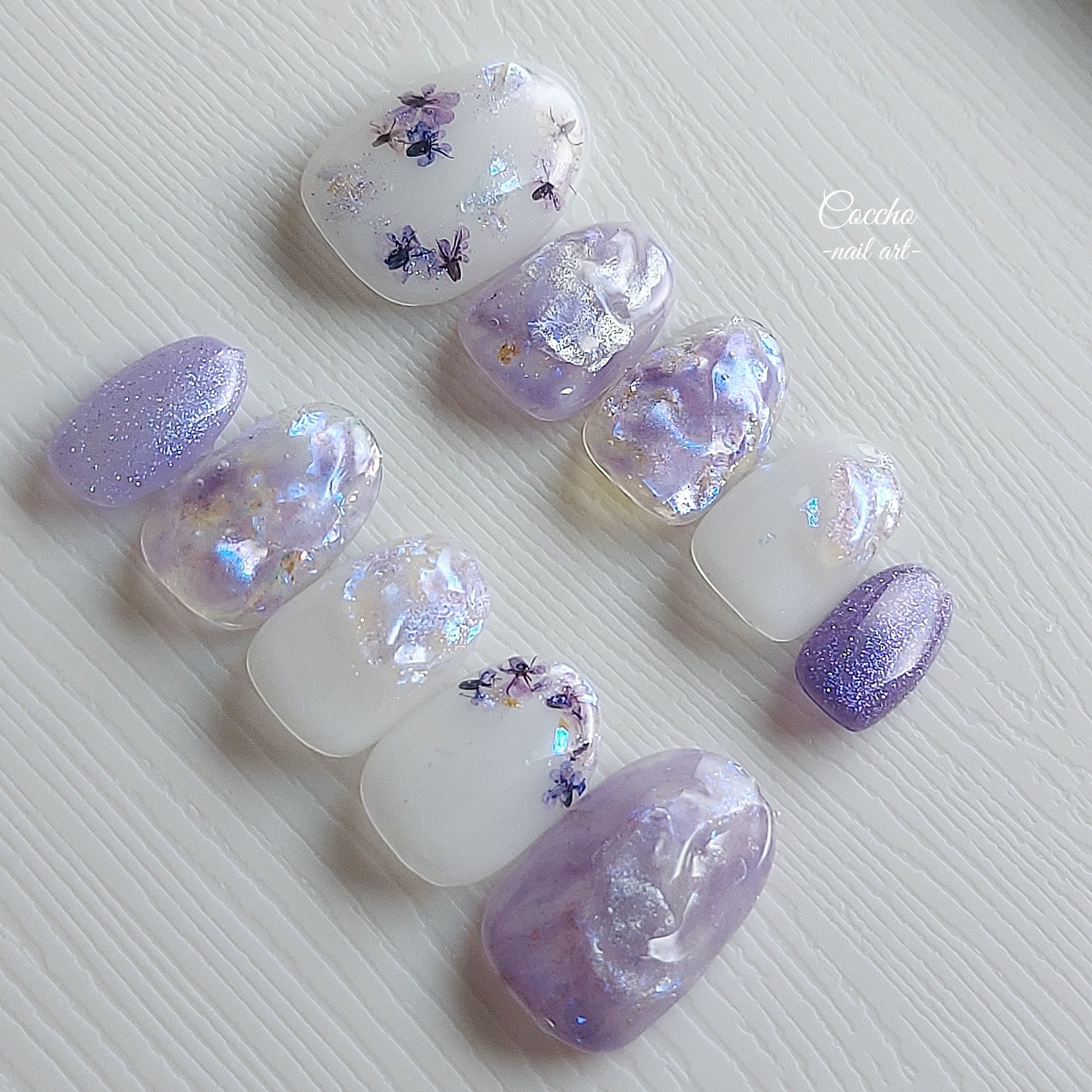 ・左人差し指、右親指→シアーホワイトをベースに、紫系押し花やシェル等で飾りました。