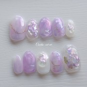 ・左親指、右人差し指→フレークやシェル等を使ったパープル系のニュアンスネイルに、表面をオーロラうるうるにしました。