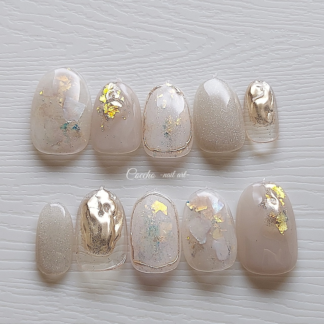 ・左親指、右人差し指→シアーくすみベージュをベースにフレーク等で飾りました。