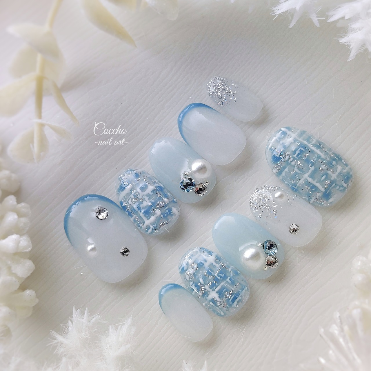 ネイルチップ ネイル ジェルネイル ブルー 青 水色 ツイード キラキラ フレンチ オーロラ 冬 クリスマス 結婚式 ウェディング ブライダル 成人式 振袖