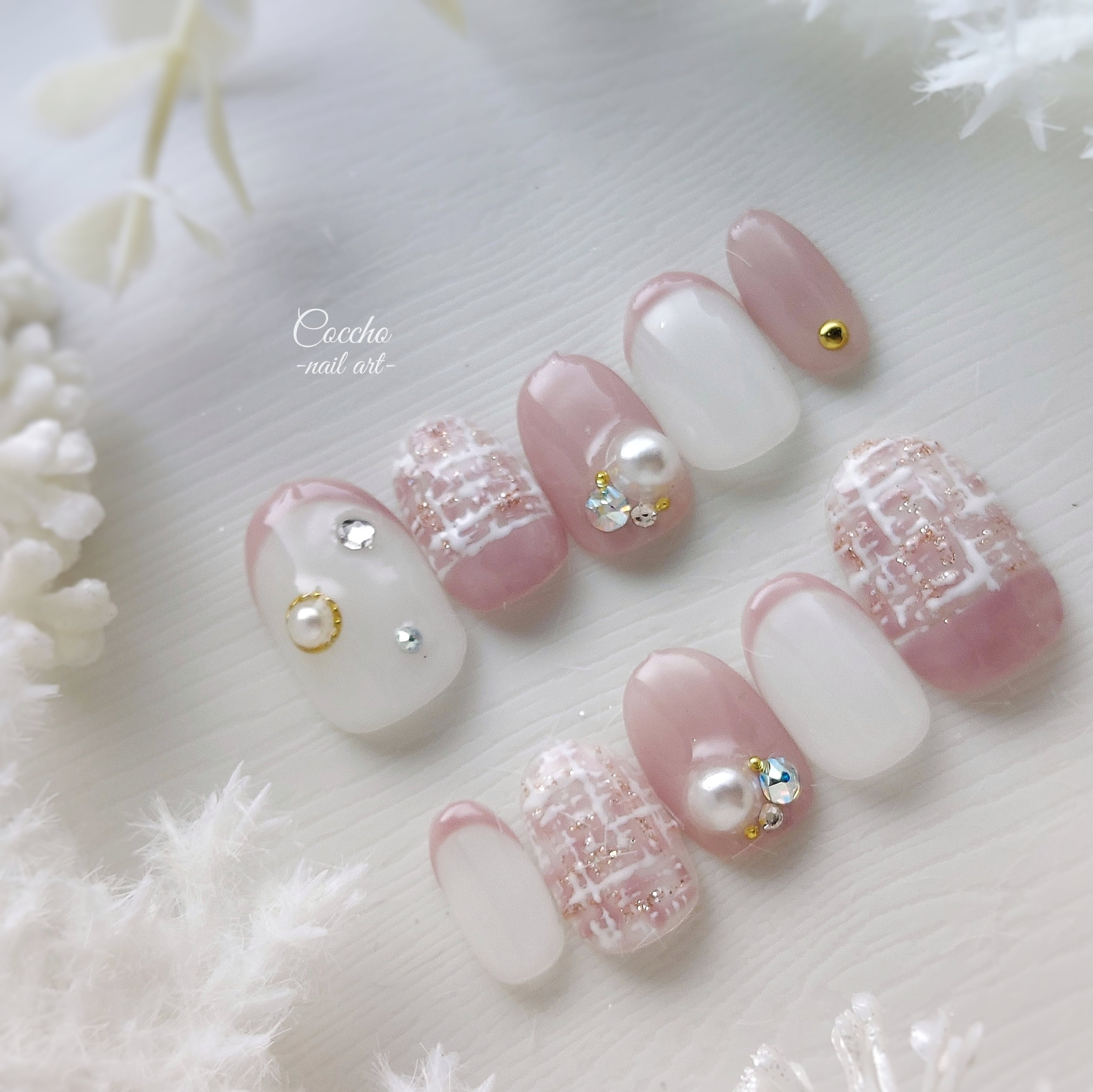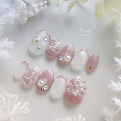 No.352 Winter pink tweed / ネイルチップ ジェルネイル ネイル ピンク 白 ホワイト ツイード キラキラ 韓国 オーロラ ビジュー フレンチ 冬 クリスマス 結婚式 ウェディング ブライダル 成人式 振袖