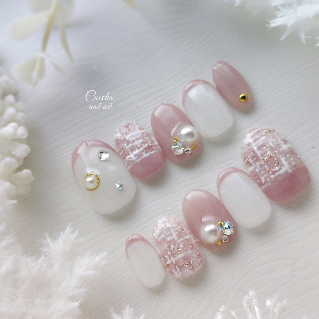 ネイルチップ ジェルネイル ネイル ピンク 白 ホワイト ツイード キラキラ 韓国 オーロラ ビジュー フレンチ 冬 クリスマス 結婚式 ウェディング ブライダル 成人式 振袖