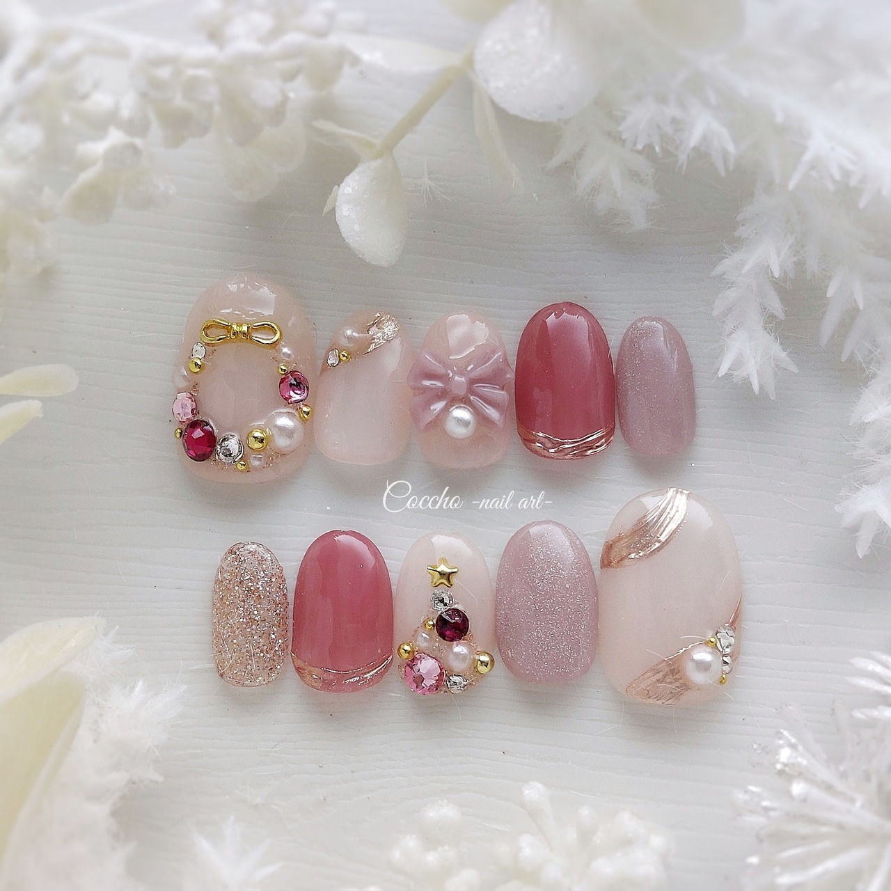 No.356 Christmas-Pink- / ネイルチップ ジェルネイル ネイル ピンク ホワイト ベージュ クリスマス リース ツリー ラメ リボン ビジュー 韓国 キラキラ ミラー マグネット 冬 雪