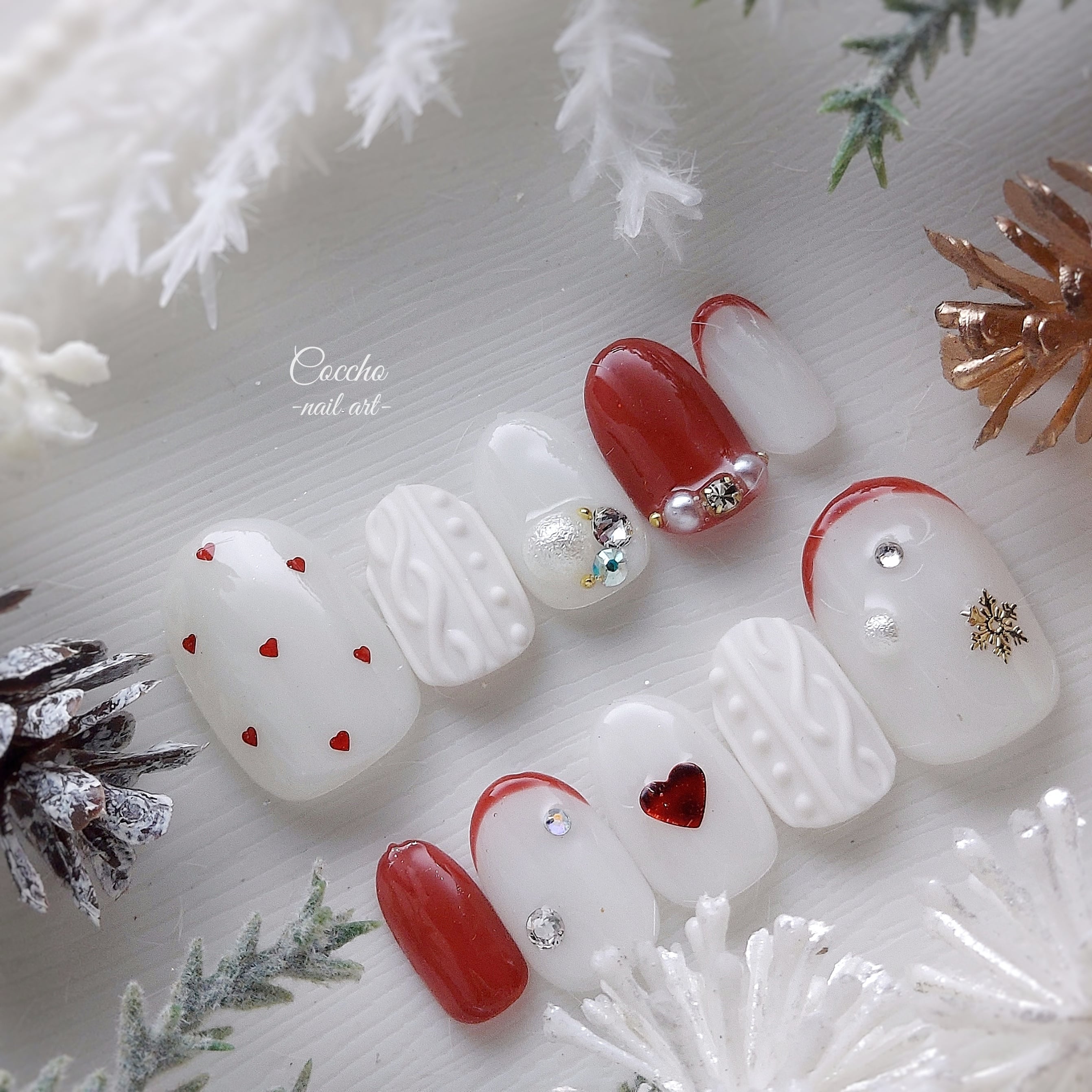 ネイルチップ ジェルネイル ネイル 赤 白 ホワイト クリスマス ハート 雪 オーロラ ニット 冬 ビジュー フレンチ