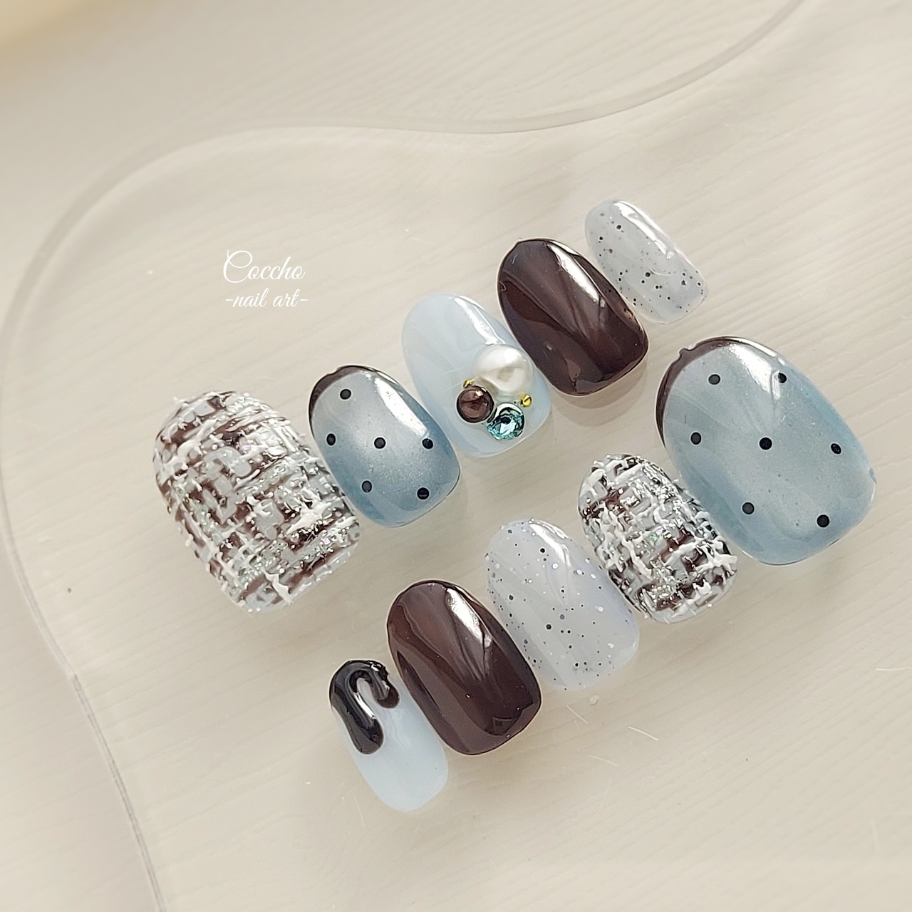 ネイルチップ ネイル ジェルネイル ブルー 水色 ツイード バレンタイン チョコミント マグネット ビー玉 チョコ 韓国 キラキラ フレンチ ドット 結婚式 ウェディング ブライダル 成人式 振袖