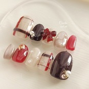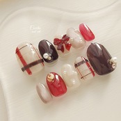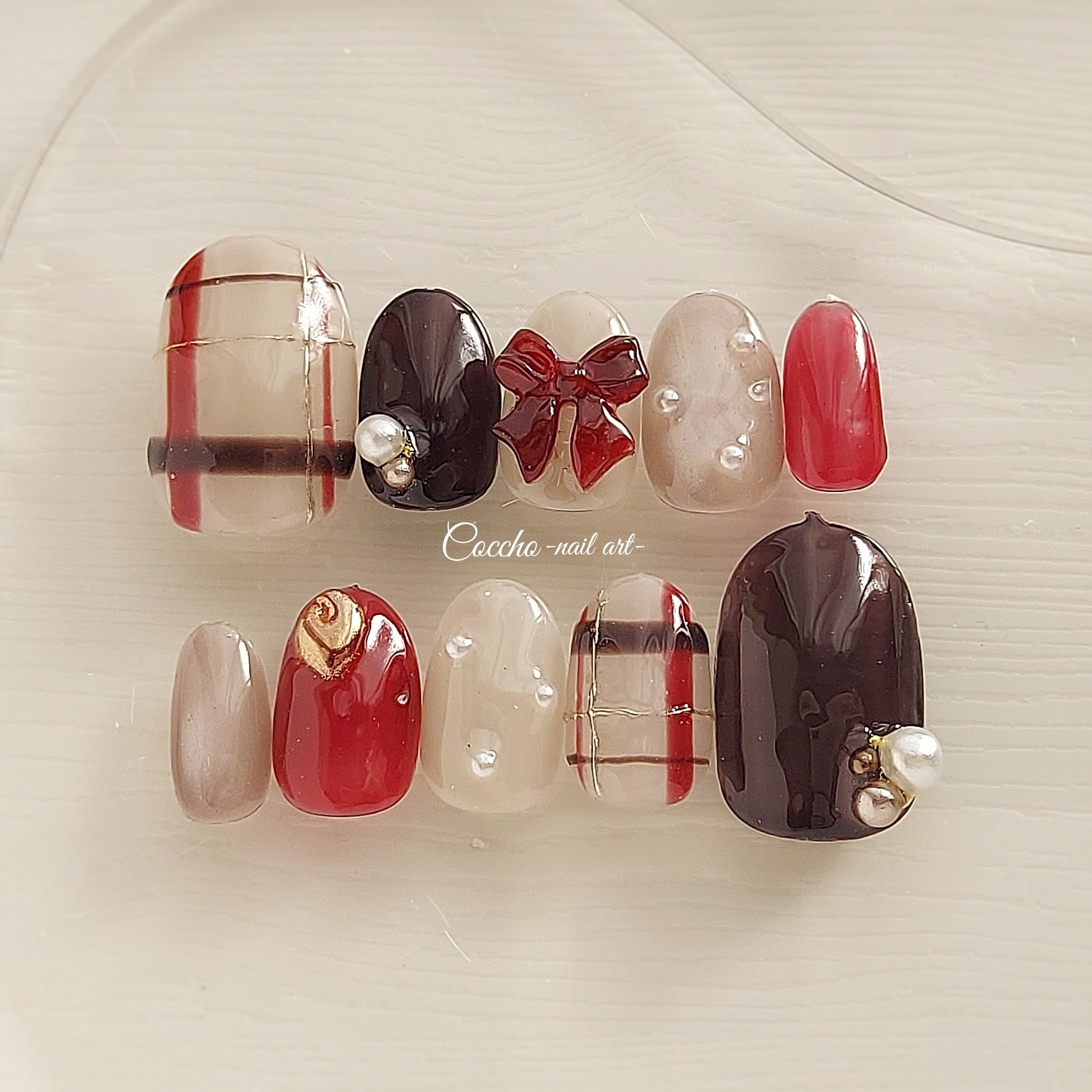 ネイルチップ ネイル ジェルネイル 赤 ブラウン 茶 チェック リボン バレンタイン ミラー チョコレート マグネット ビー玉 結婚式 ウェディング ブライダル 成人式 振袖