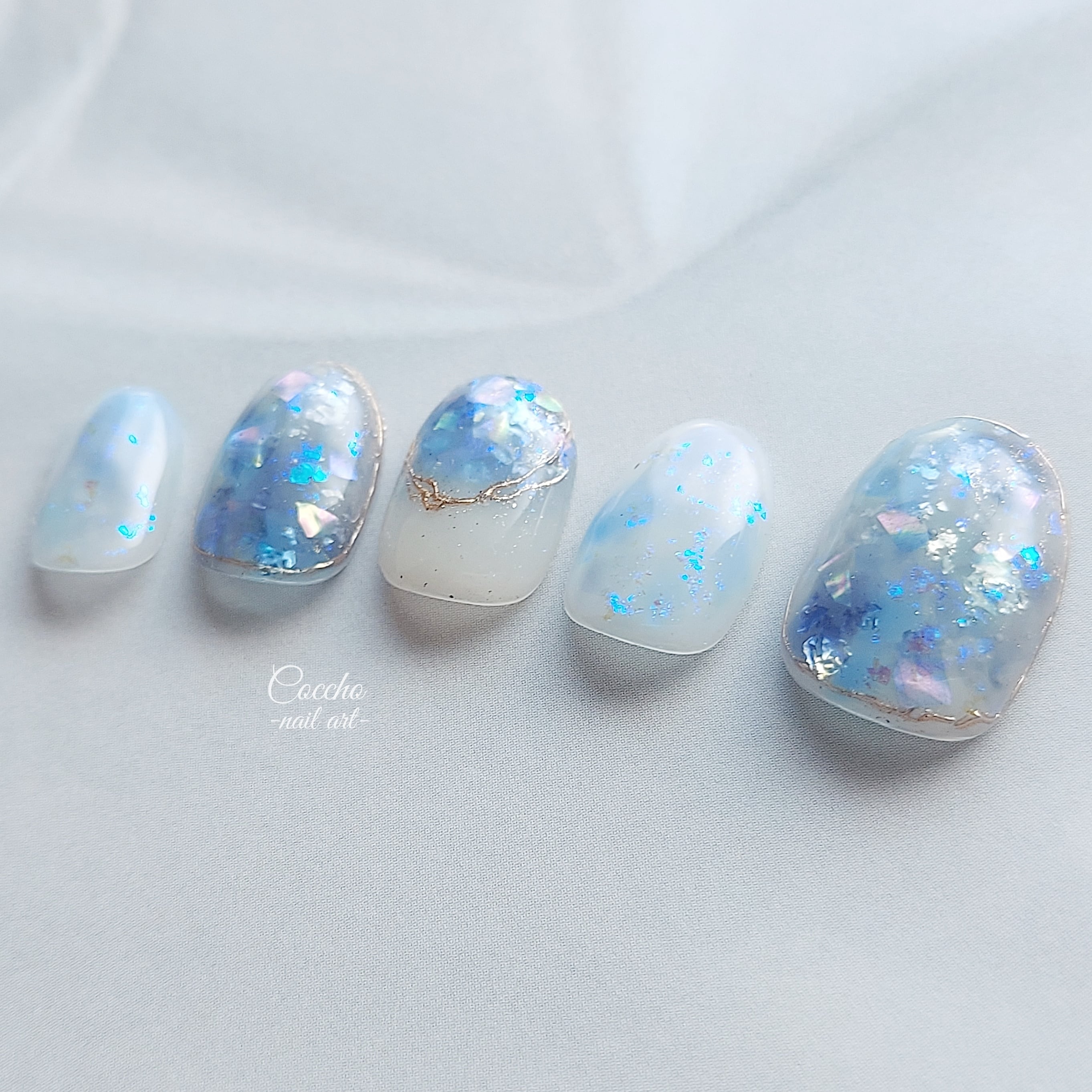 親指・薬指→ブルー系のカラーやオーロラシェルを使い細めミラーで囲みました。