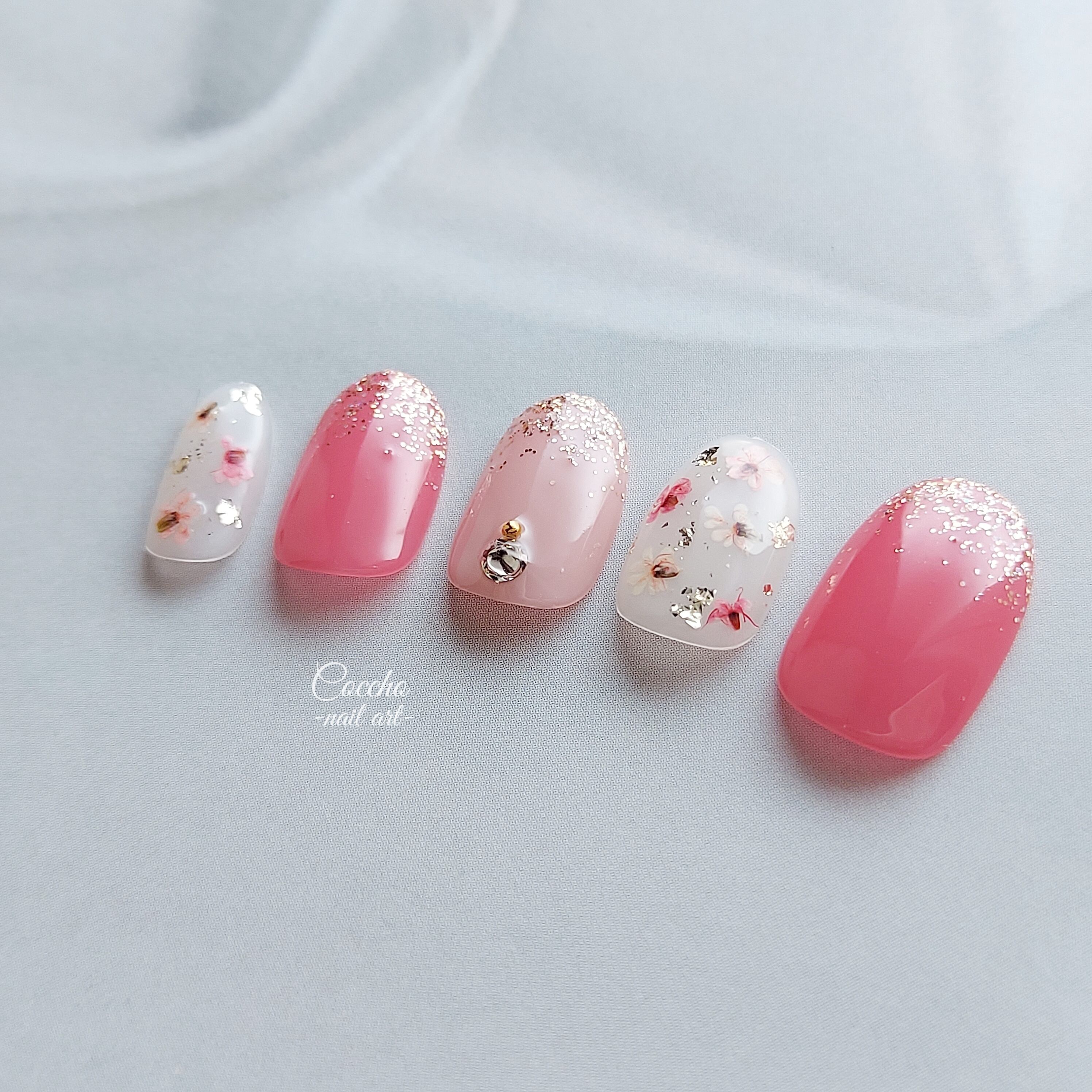 人差し指・小指→シアーホワイトをベースにコーラルピンク系押し花を飾りました。