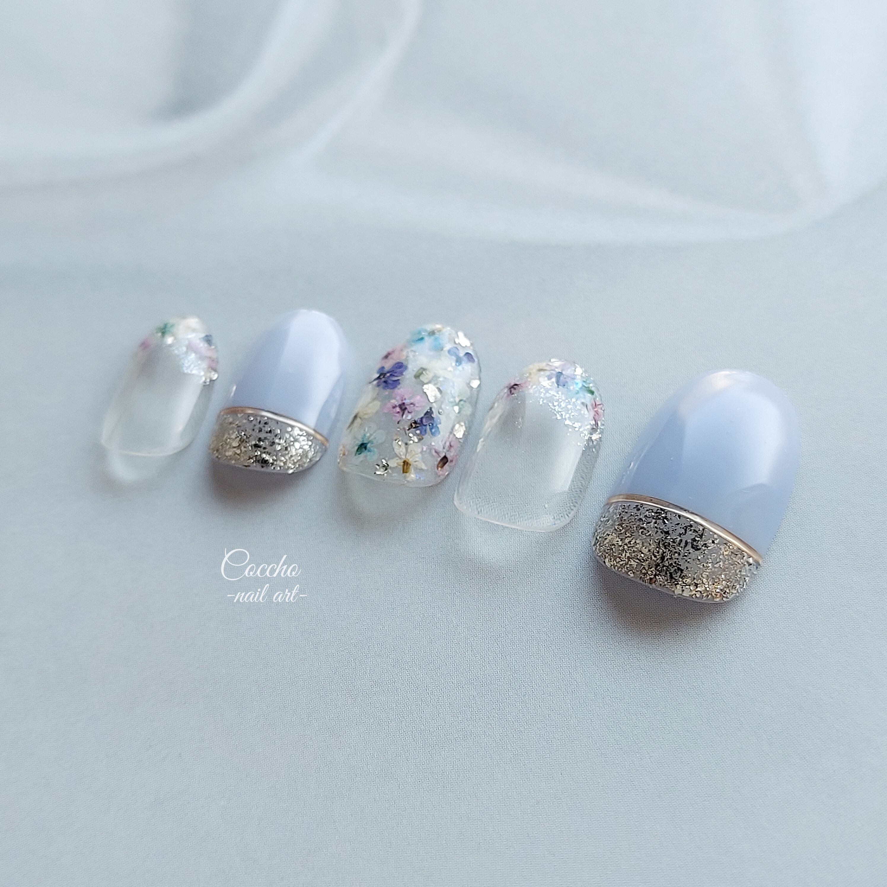 No.80 キラキラフレンチフラワーネイル(ラベンダーブルー) / ジェルネイル 押し花ネイル ネイルチップ ブルー パープル パステル