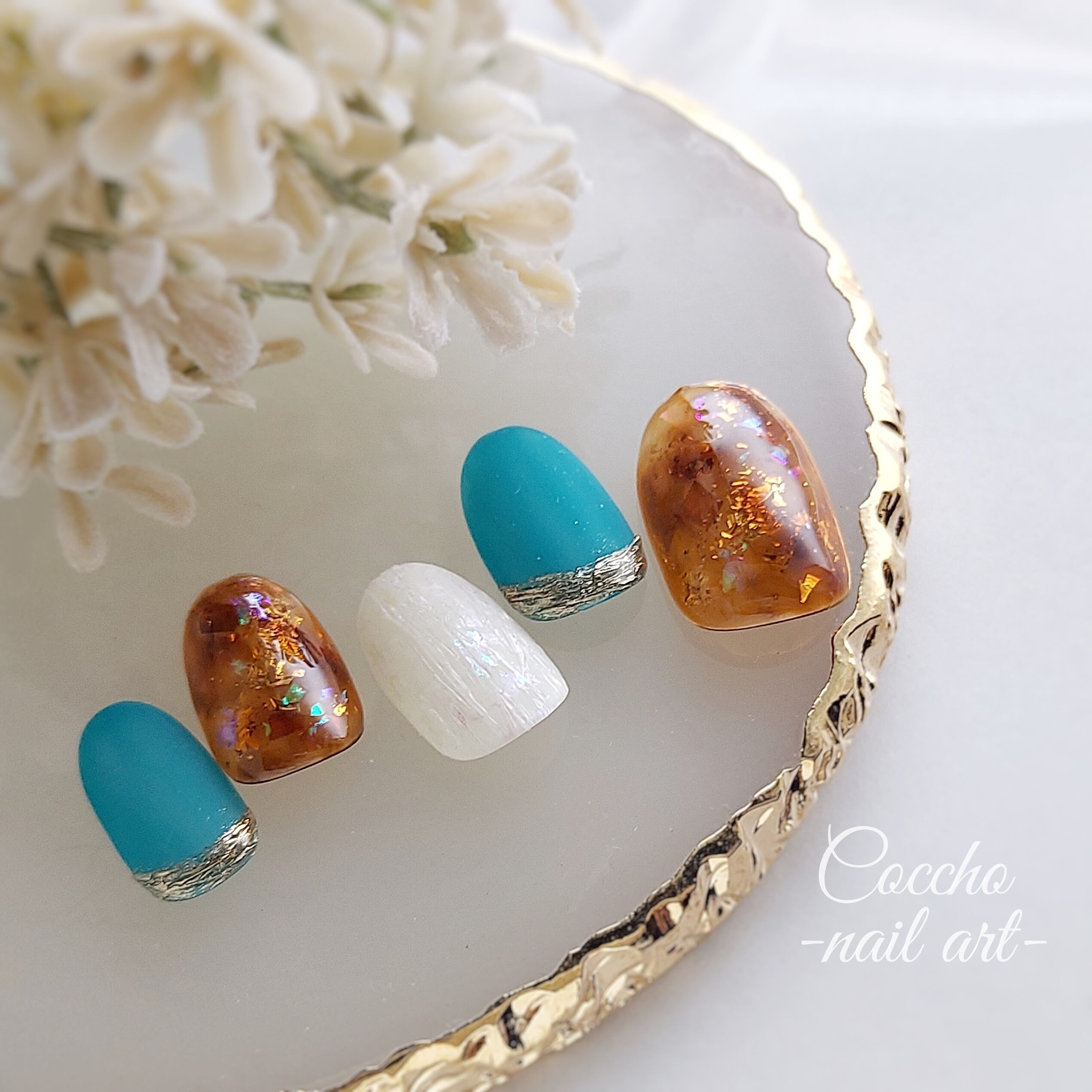 人差し指・小指→シアーなエメラルドグリーンをベースに繊細なミラーネイルをしました。(ミラー以外マット)