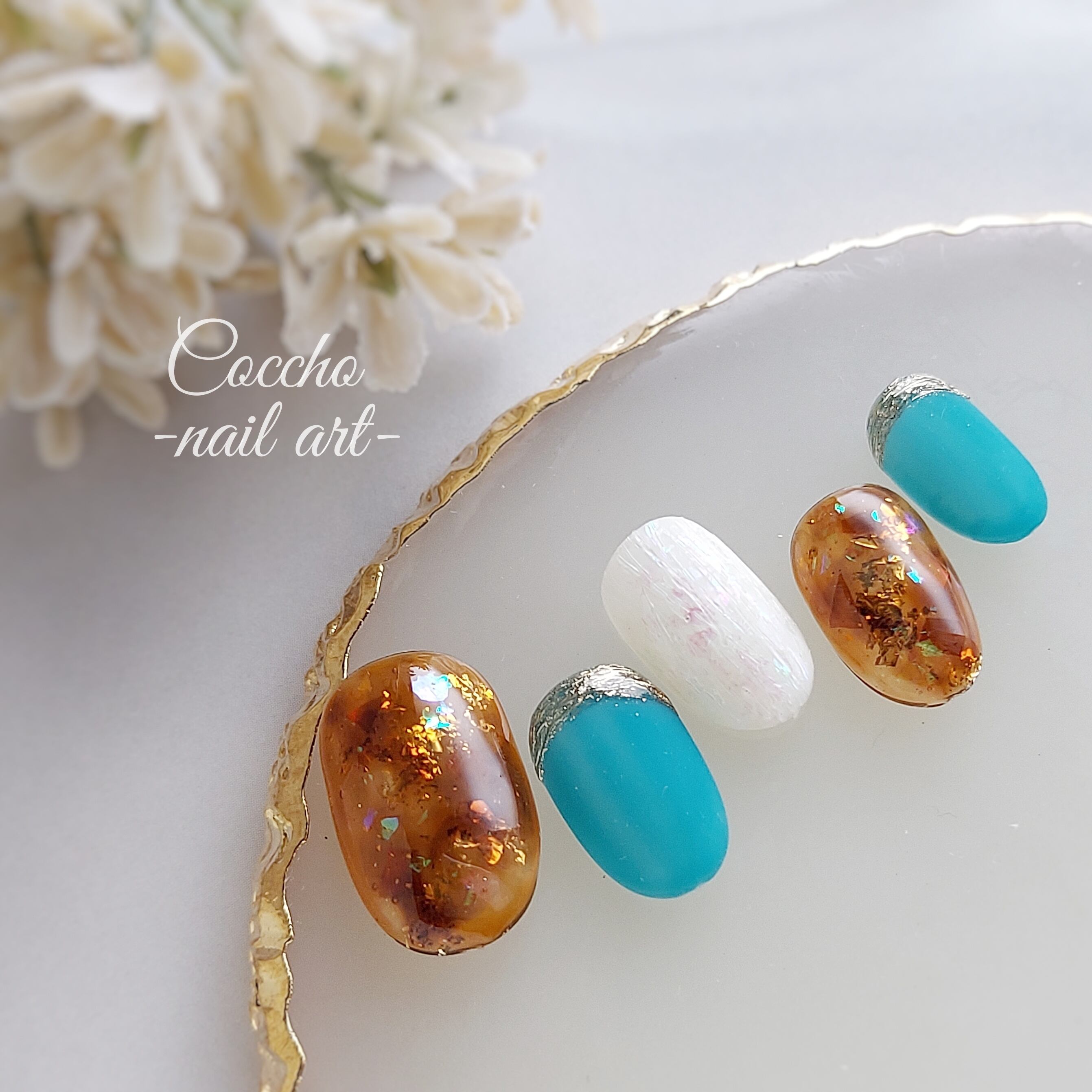 反射が綺麗な上品な鼈甲ネイルにしました。