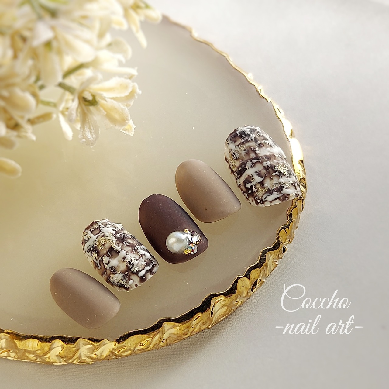 親指・薬指→ガナッシュやモカカラー、ラメをポイントで入れたツイードネイルです。(マット)