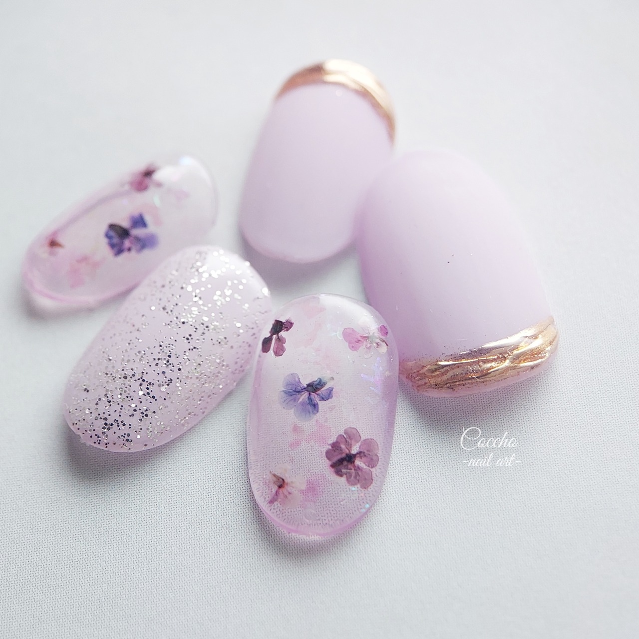 人差し指・小指→クリアパープルにダズリングパウダーや紫系の押し花を飾り、角度により反射するようにしました。