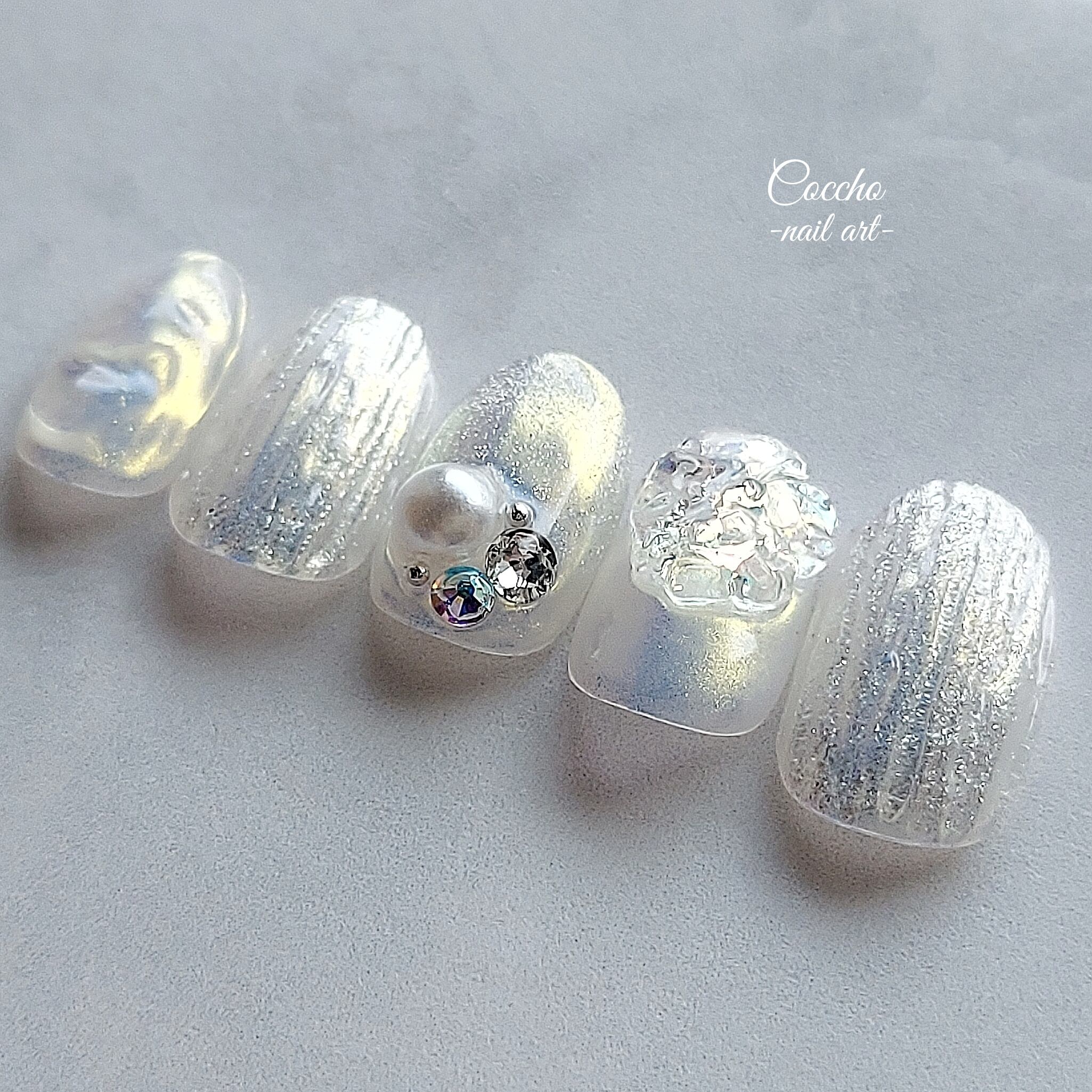 ・人差し指→オーロラベースに爪先をガラスのようなキラキラうるうるネイルにしました。